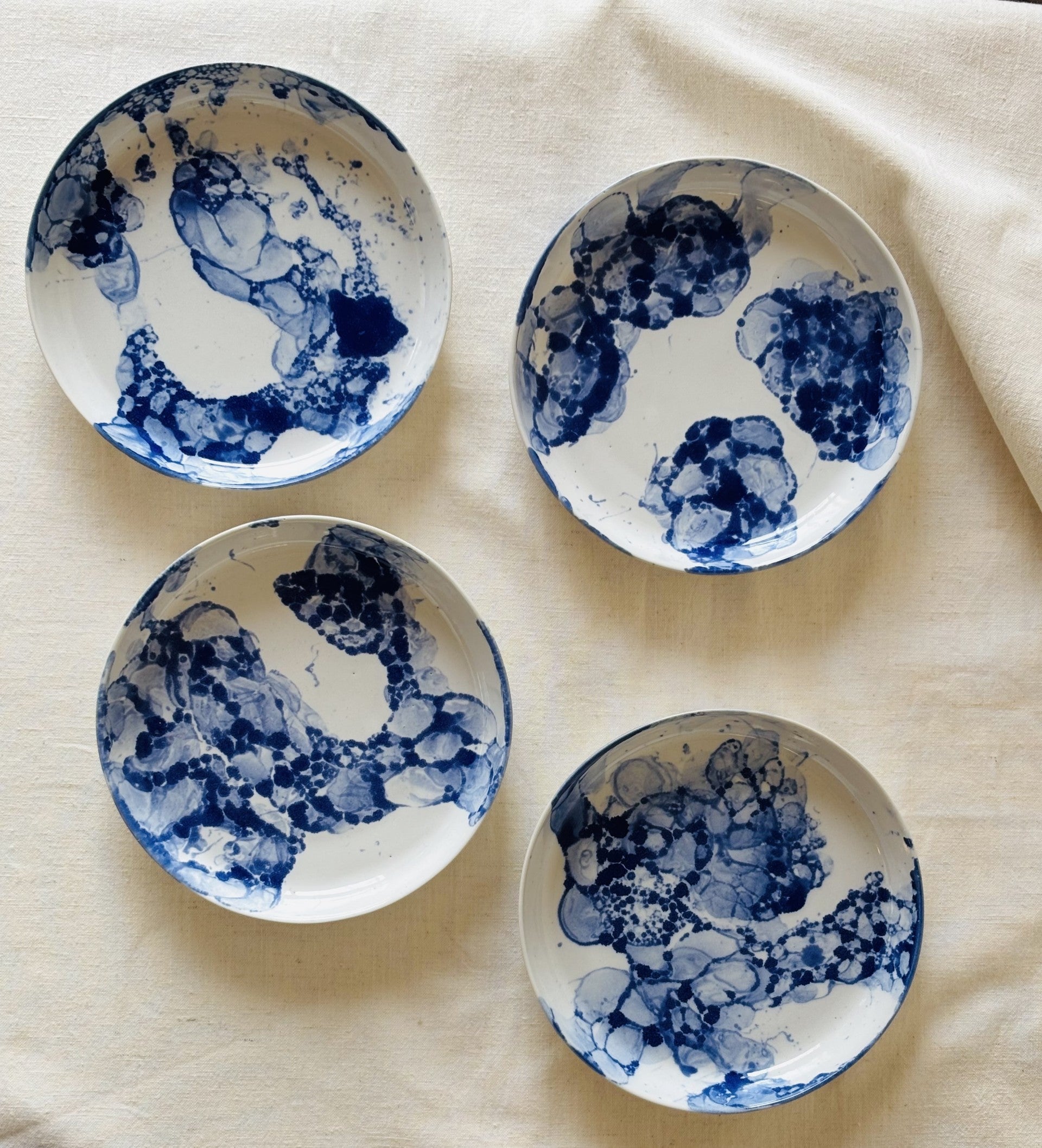 Color: The plate is first coated in a glossy white glaze, then finished with a blue bubble-glaze technique that creates unique, organic patterns on the surface.