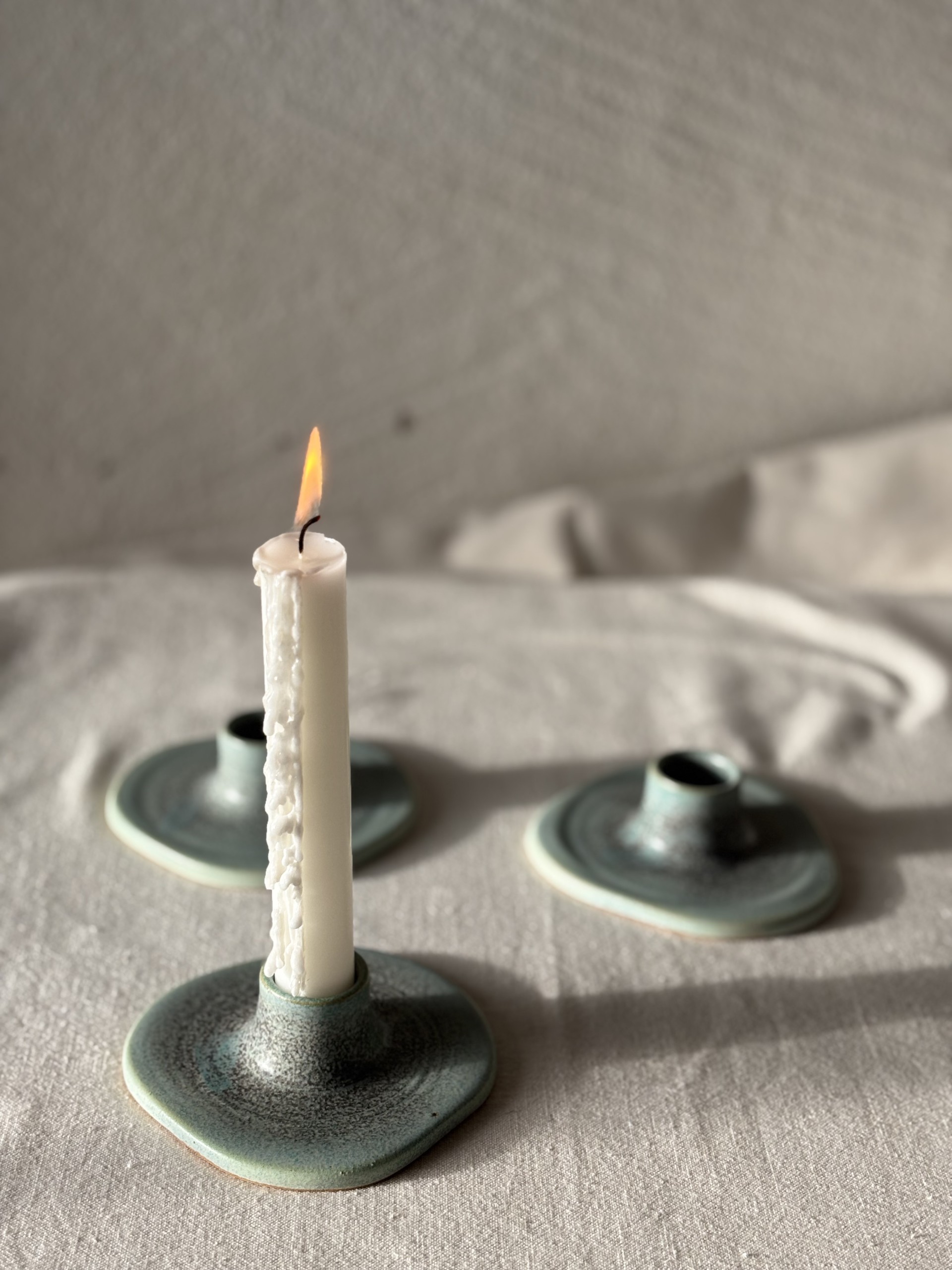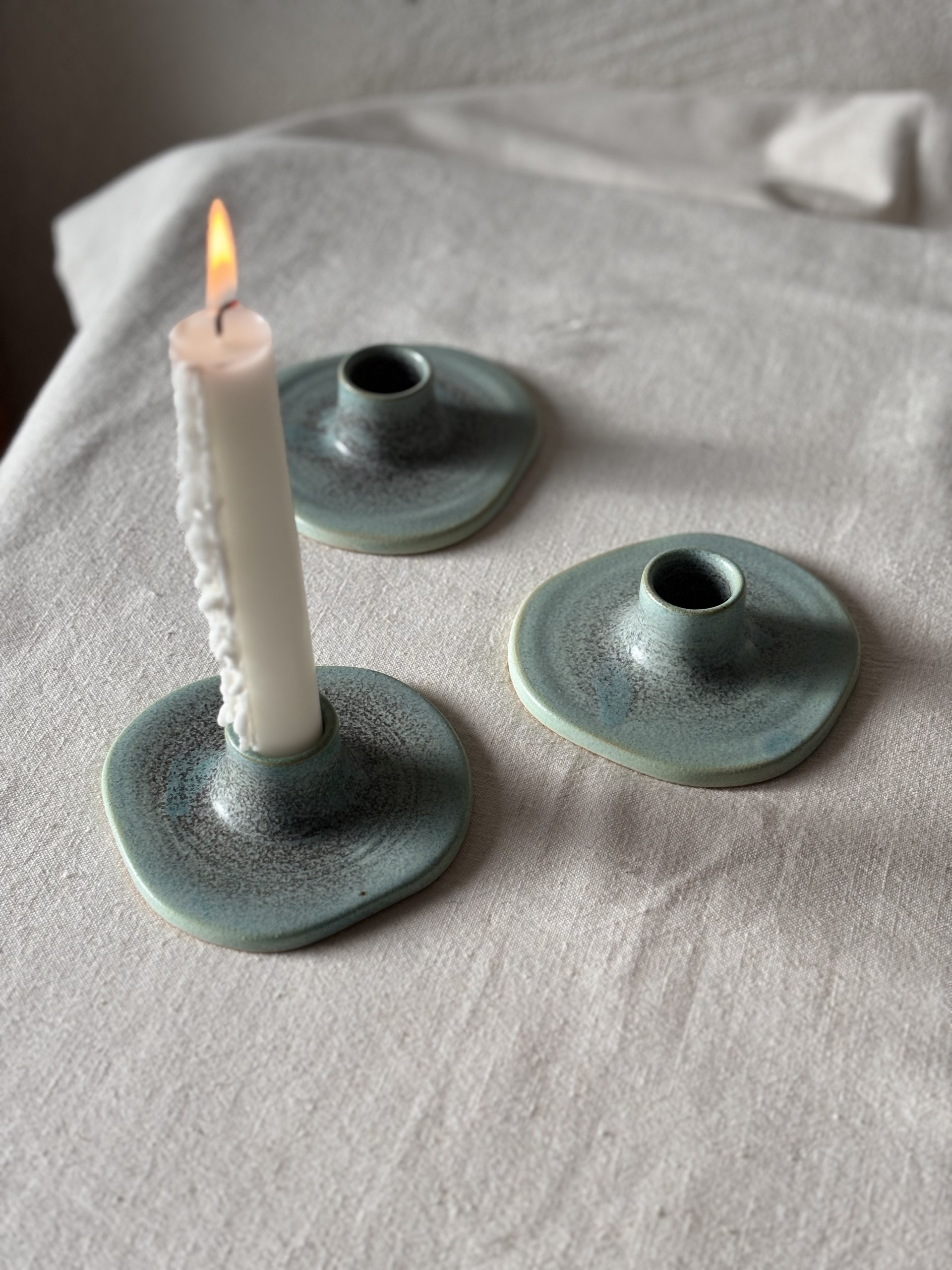 Each Asymmetric Candle Holder is individually hand-thrown in stoneware, celebrating organic form and soft imperfection. The flowing, off-center shape and subtle glaze variations make each piece feel alive and unique. Designed to hold a standard taper candle it brings a quiet warmth and sculptural beauty to any setting.