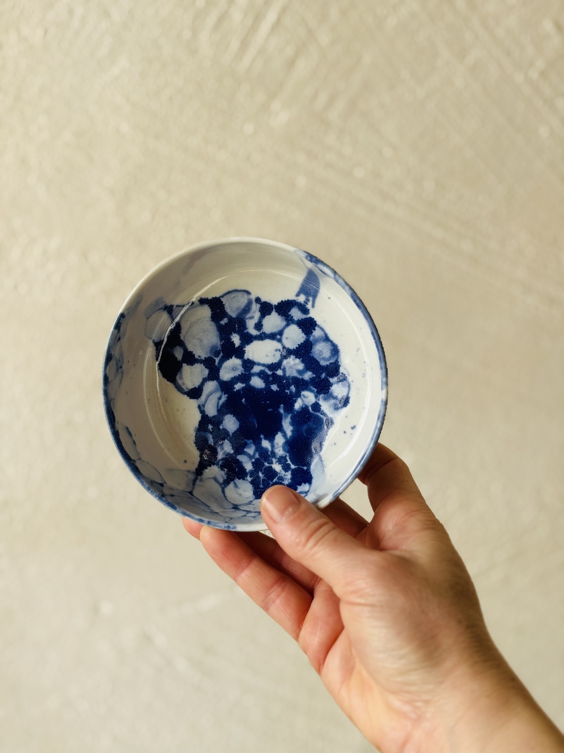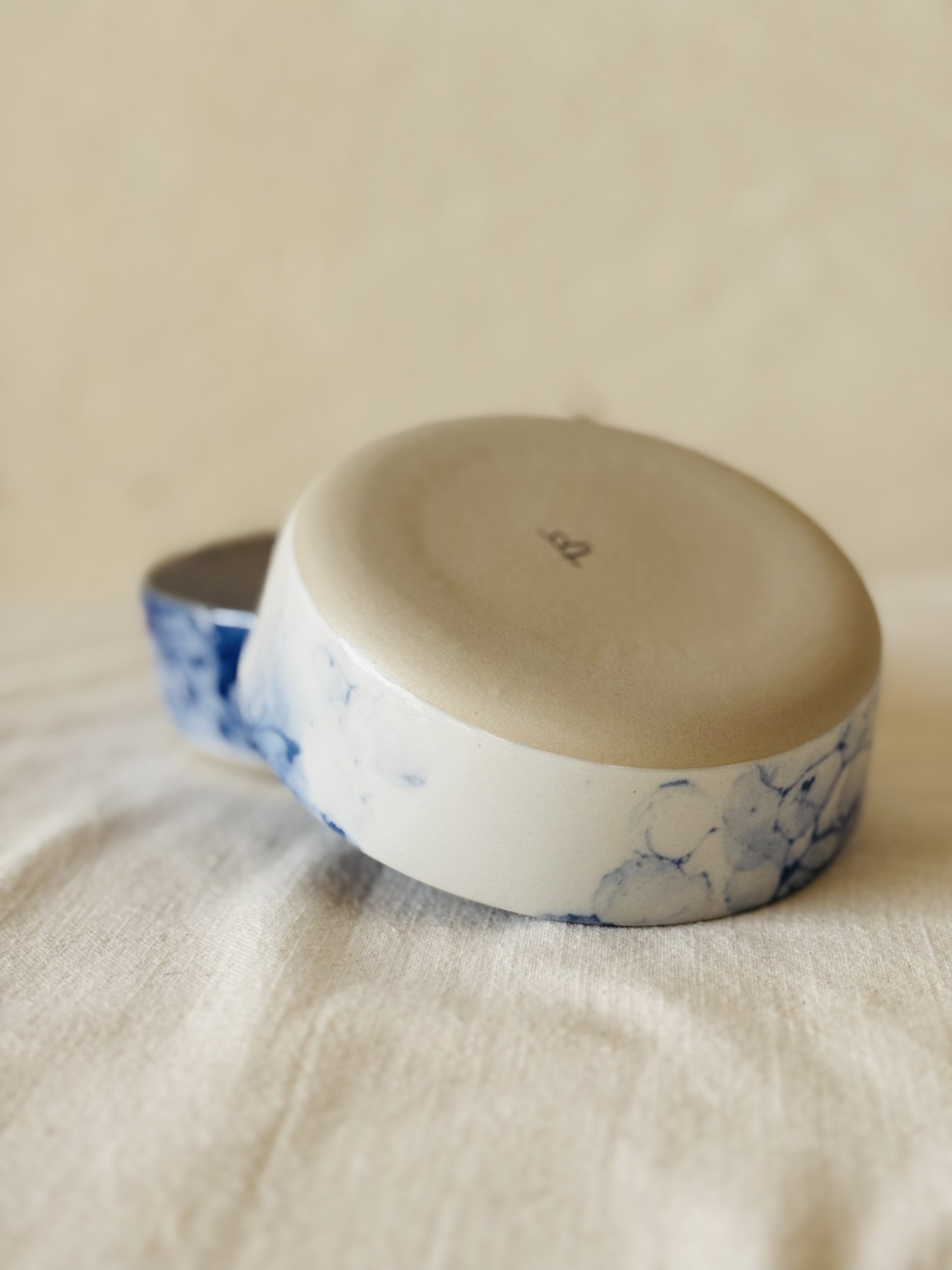 Color: The Snack Bowl is first glazed in a glossy white base. It is then decorated using a blue bubble glaze technique, creating soft, airy patterns.