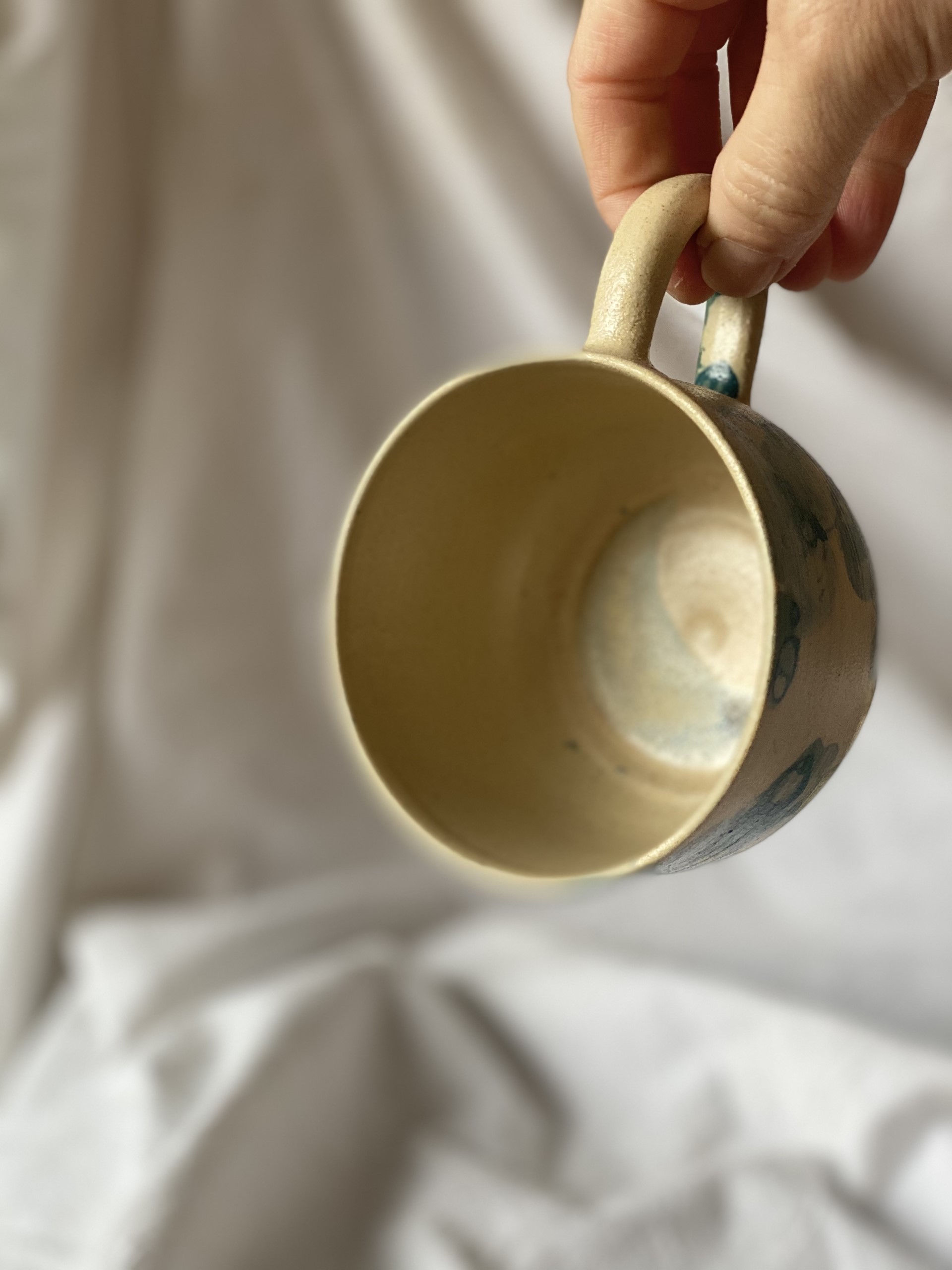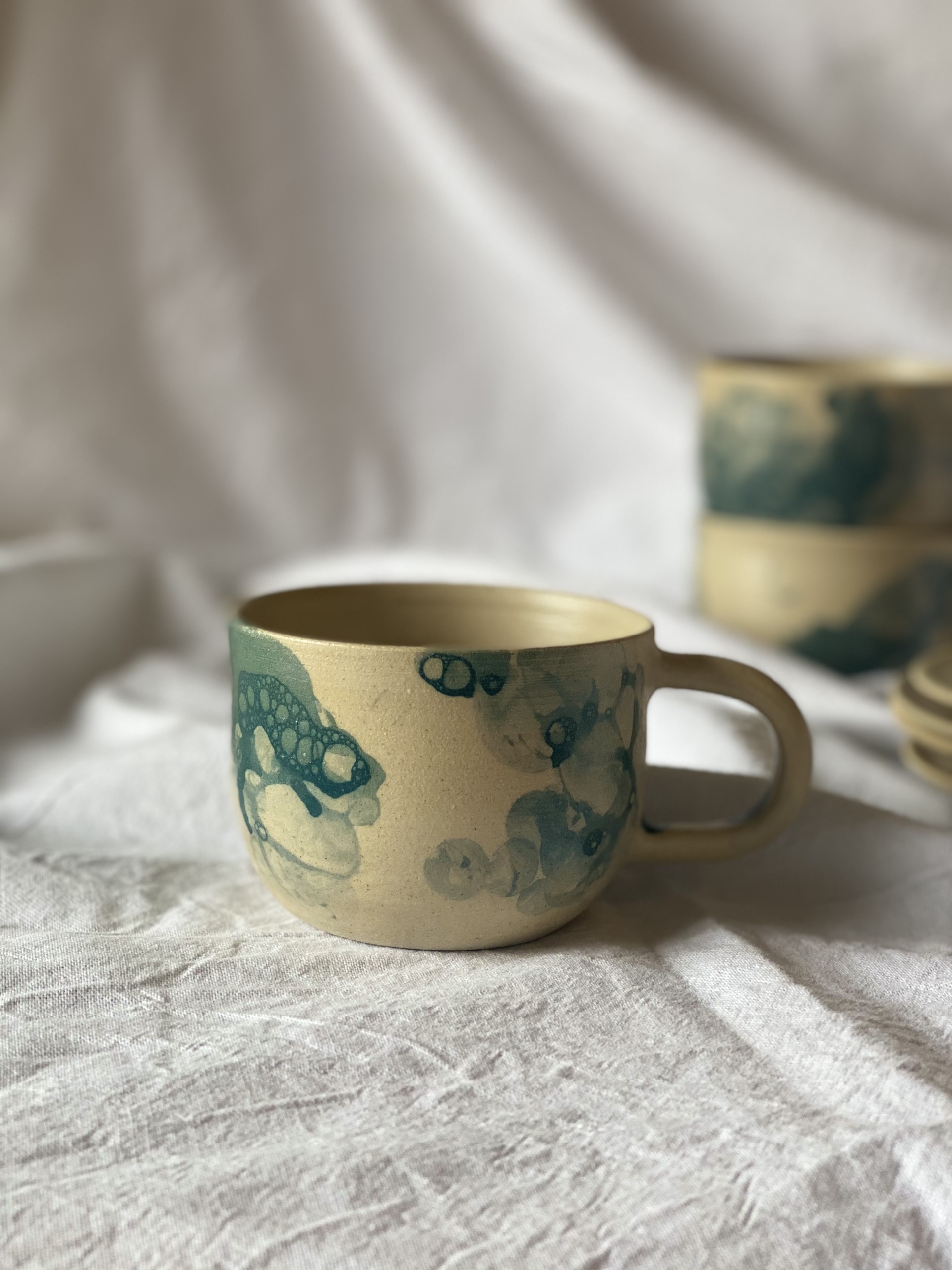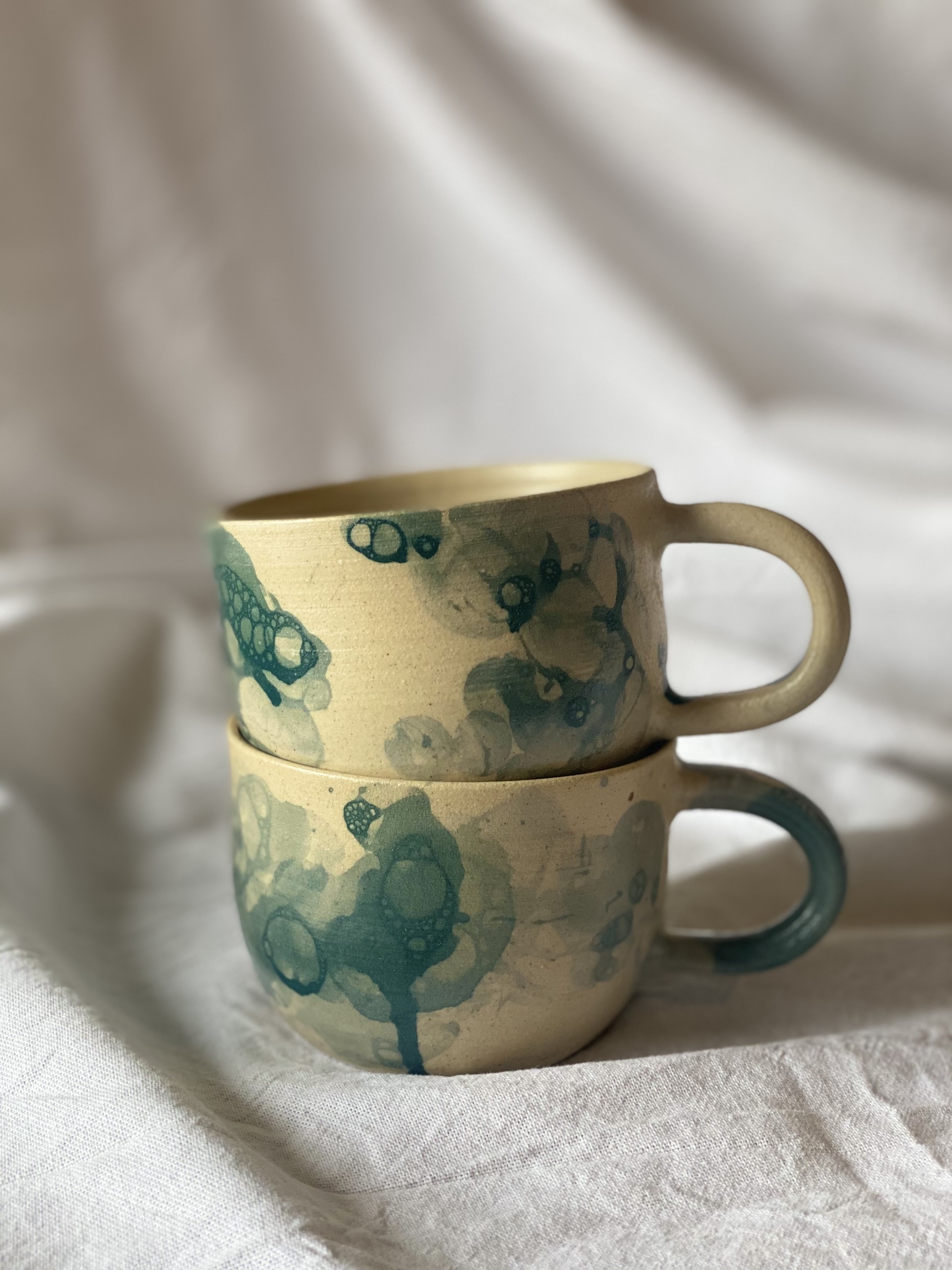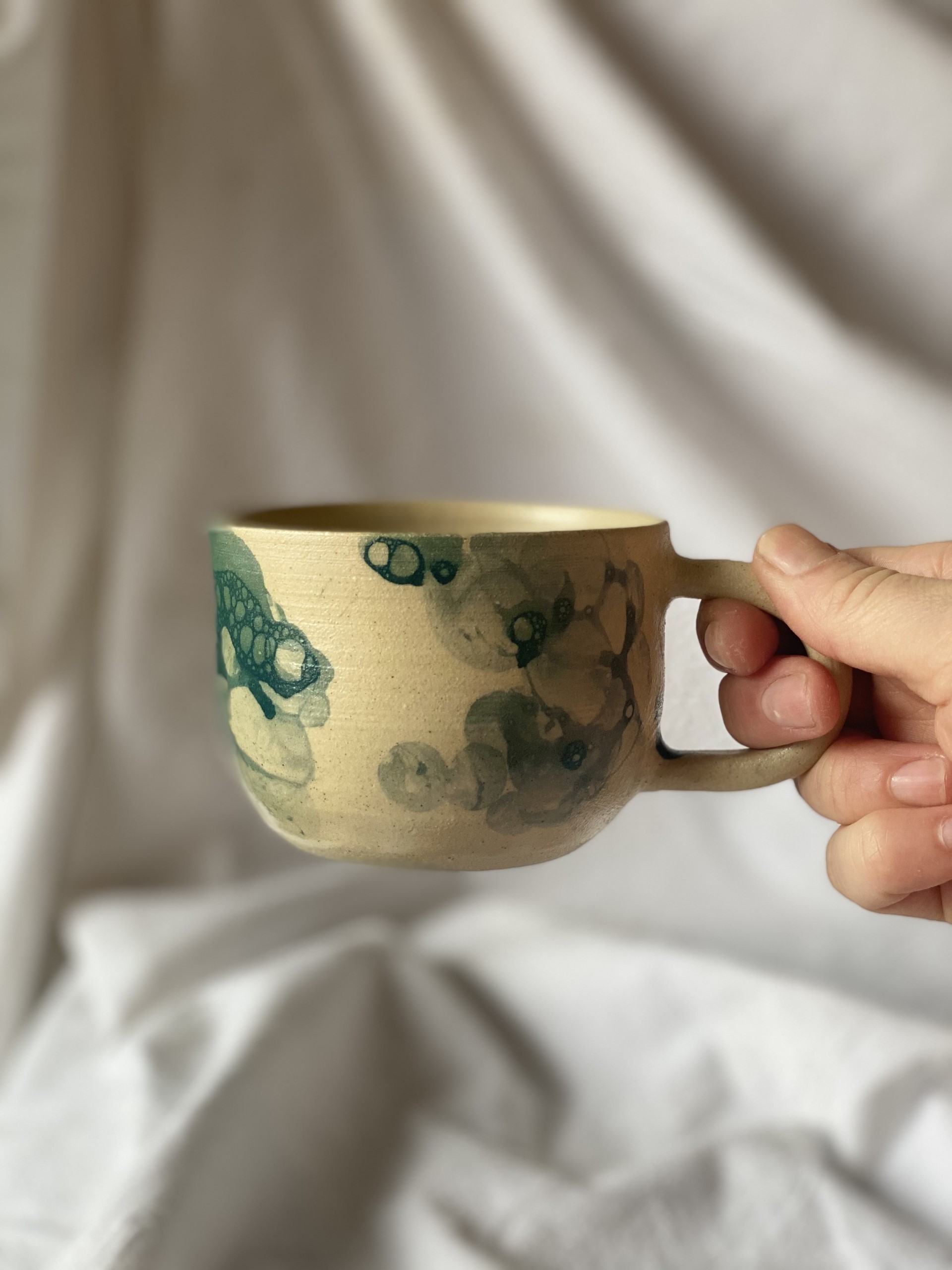 Color: The cup is first glazed in warm earthy tones. It is then finished with a green bubble glaze โ creating soft, organic patterns on the exterior.