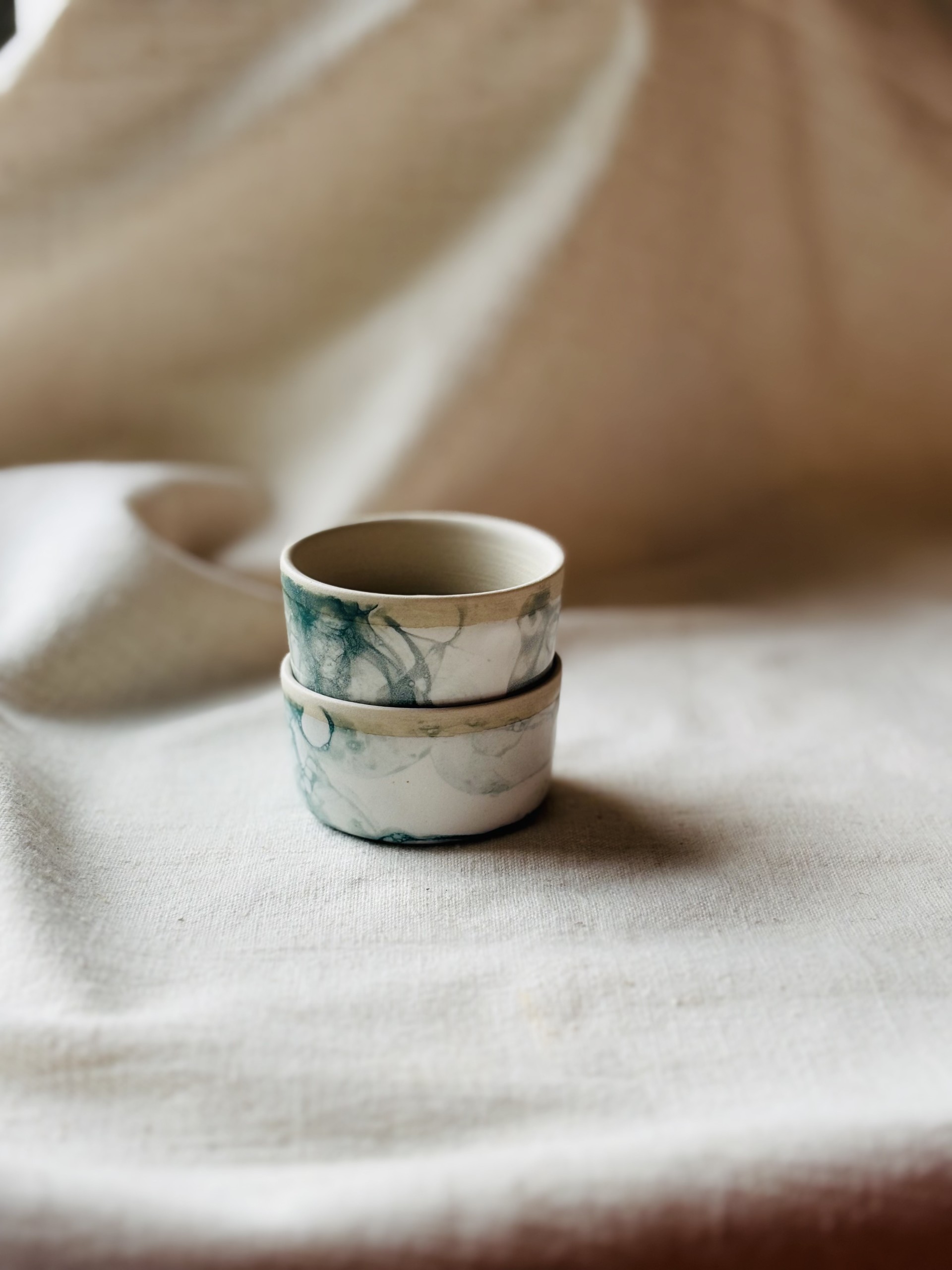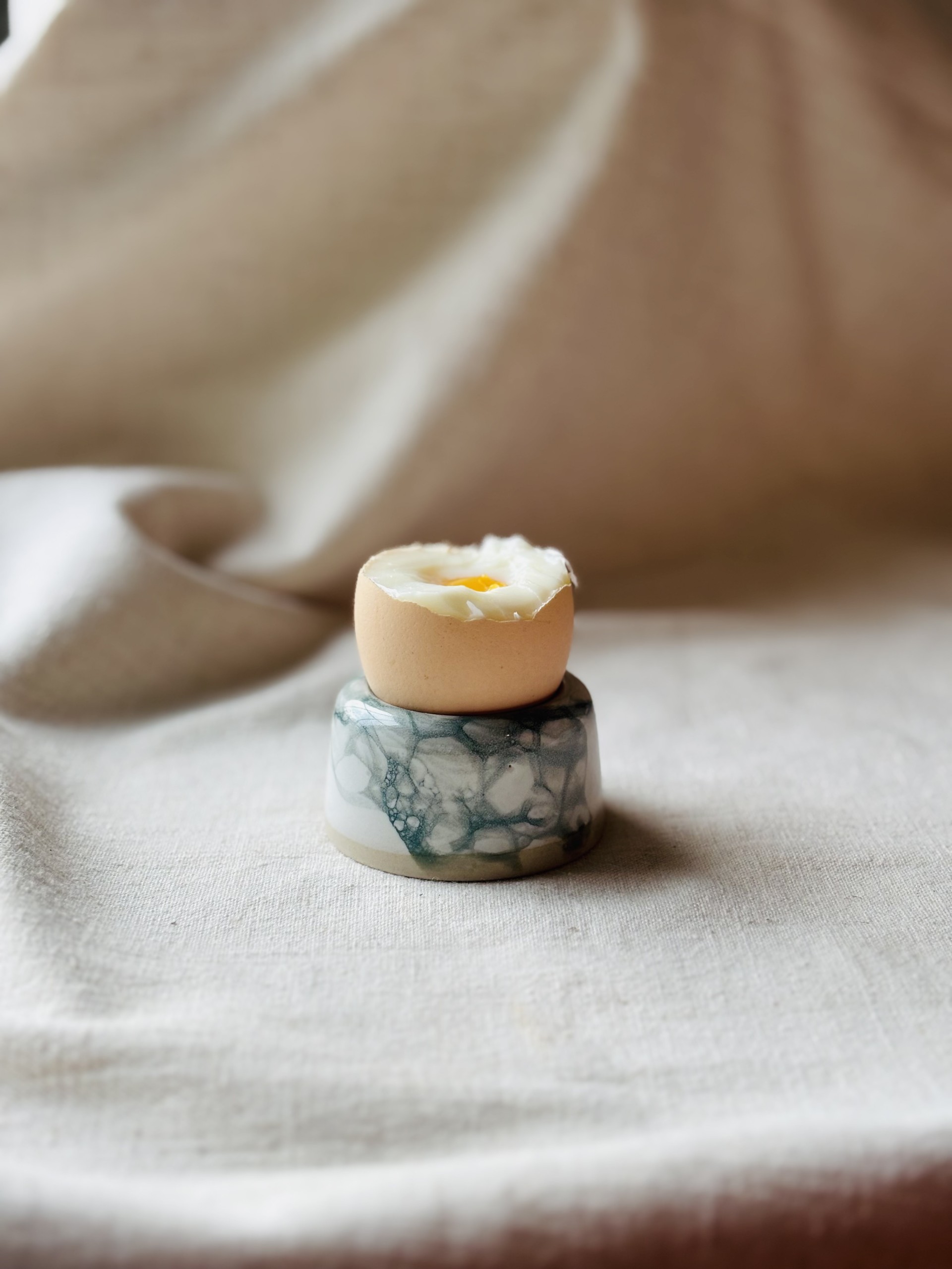 Color: The Egg Cup is first glazed in a glossy white base. It is then decorated using a green / blue bubble glaze technique, creating soft, airy patterns.