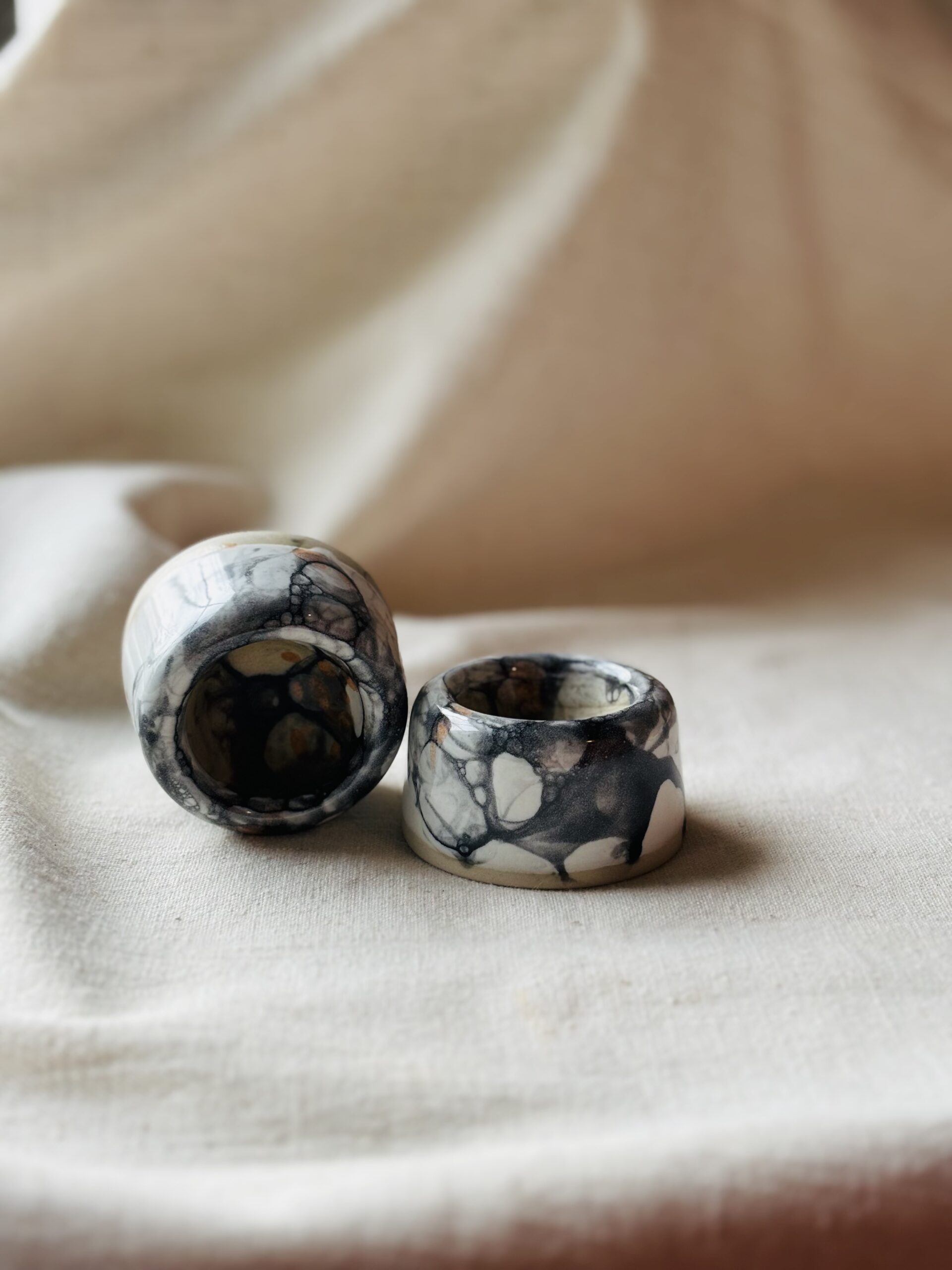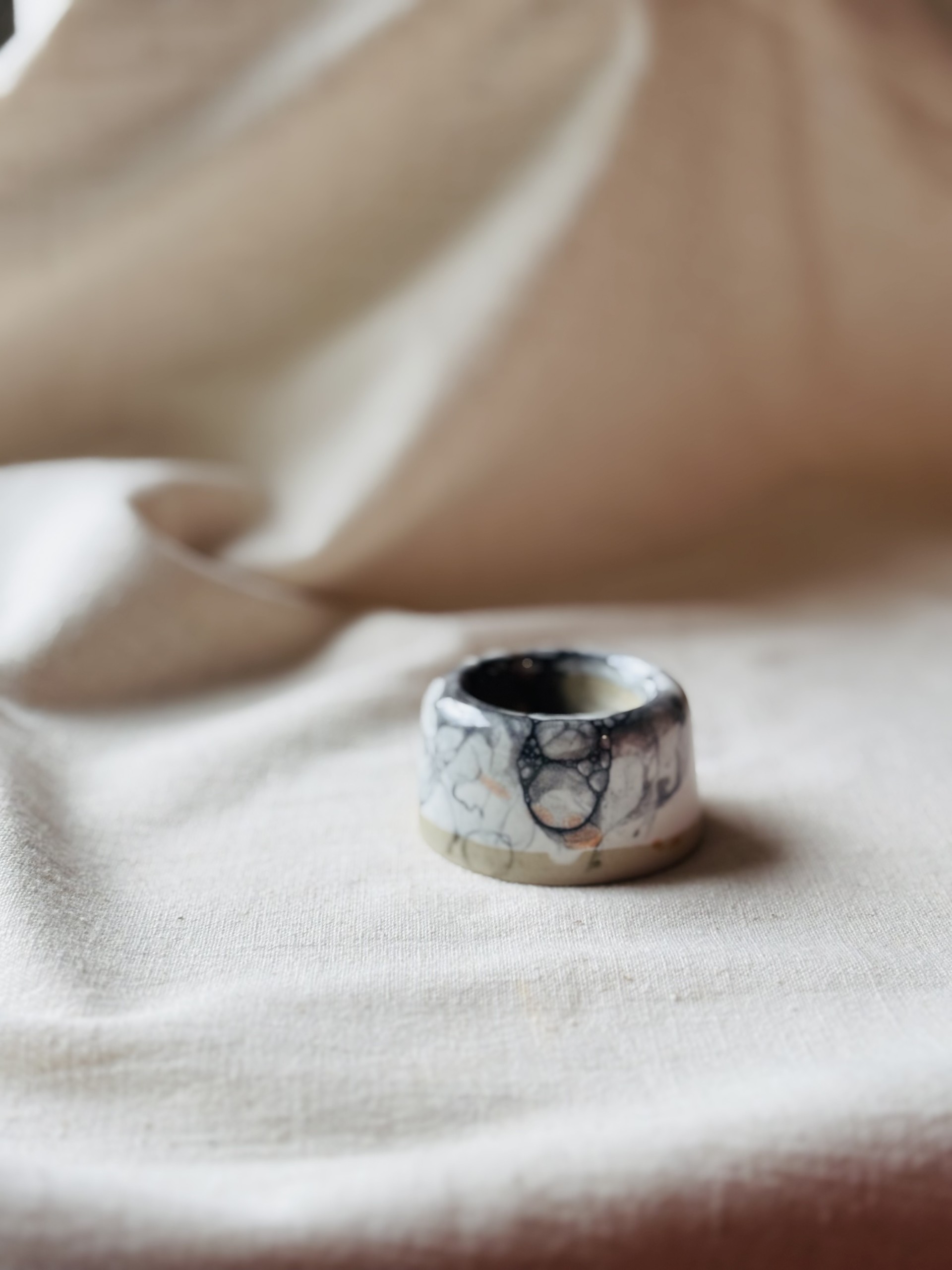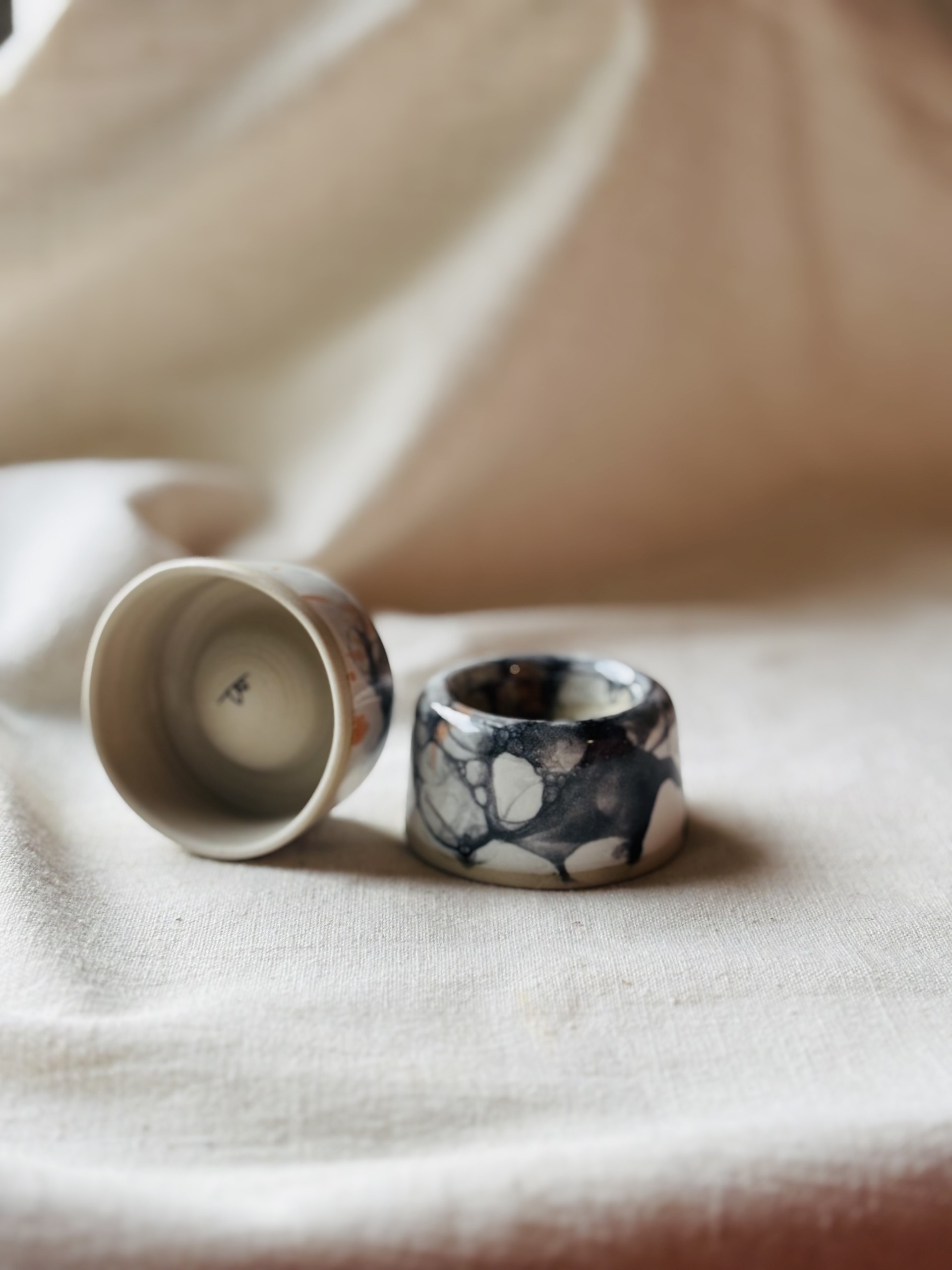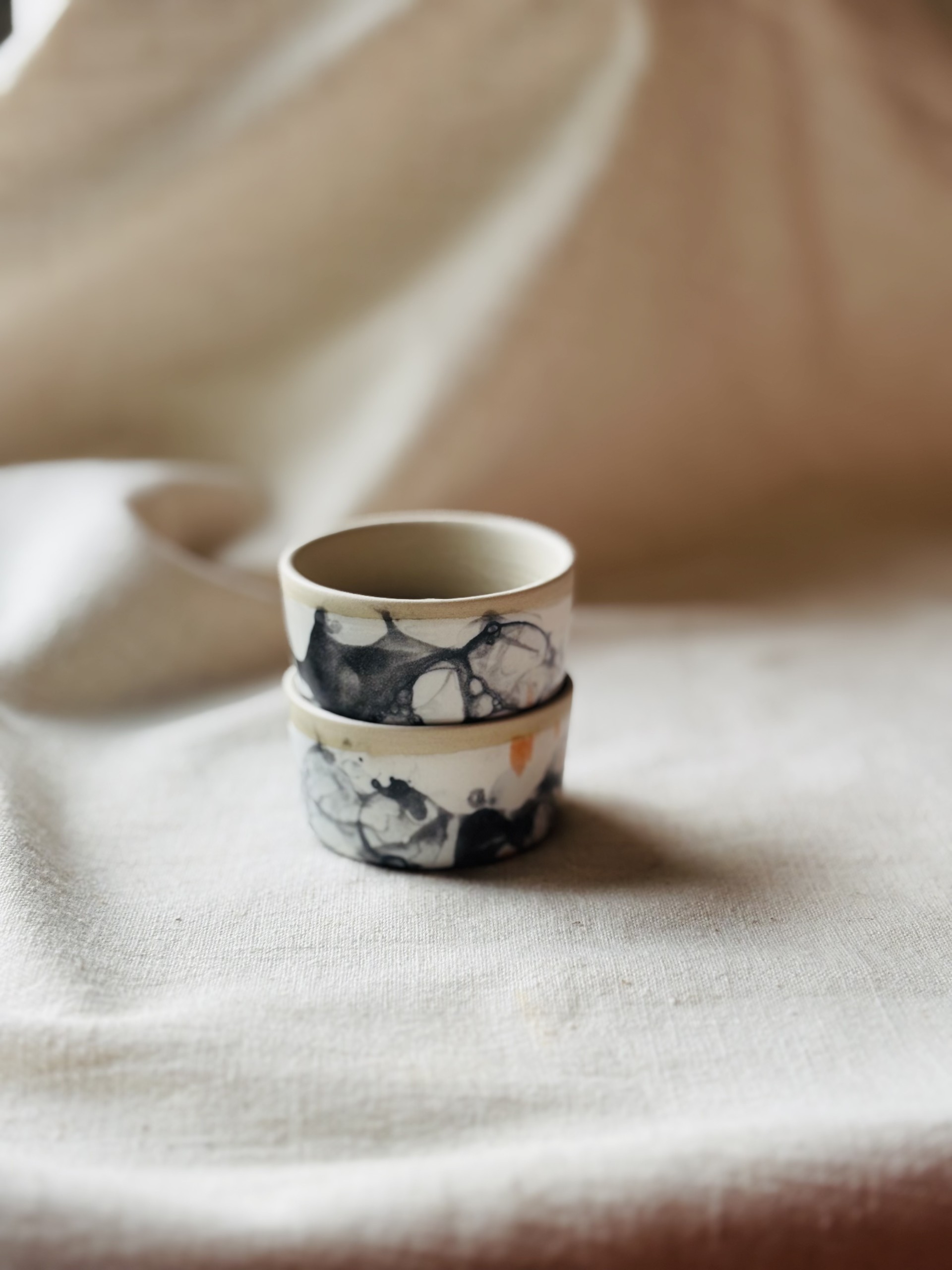 Color: The Egg Cup is first glazed in a glossy white base. It is then decorated using a black bubble glaze technique, creating soft, airy patterns. Finally, touches of orange glaze are splashed across the surface for a subtle contrast and warmth.