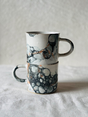 Color: The cup is first glazed in a glossy white base. It is then decorated using a black bubble glaze technique, creating soft, airy patterns. Finally, touches of orange glaze are splashed across the surface for a subtle contrast and warmth.