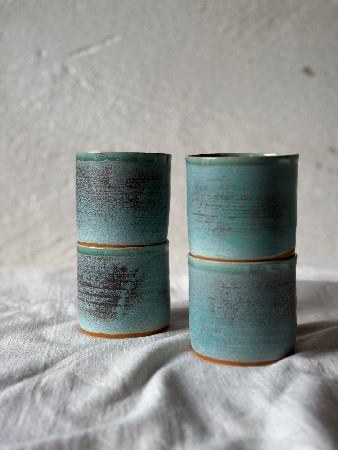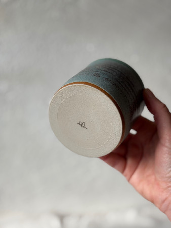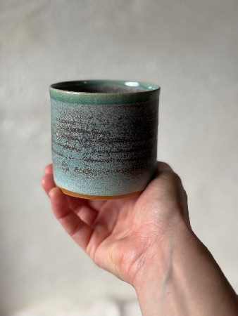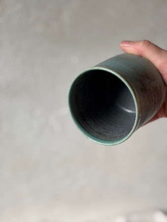 Color: Glazed in a blue-green tone with a muted sea-green color featuring blue and gray undertones reminiscent of aged copper. The rim is coated with a glossy glaze that provides a pleasant feel when drinking from the cup.