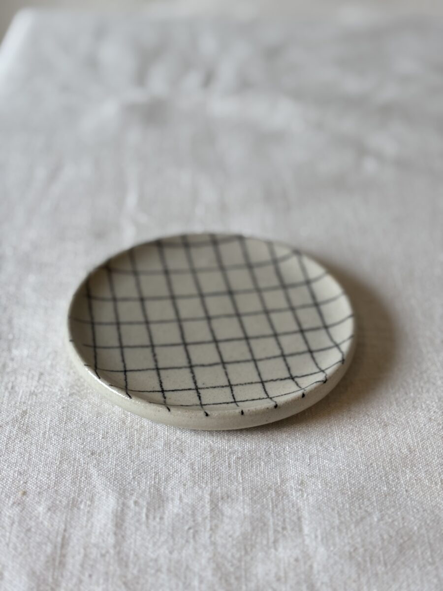 Color: Hand-drawn black checkered pattern on beige stoneware, finished with a transparent glossy glaze that lets the natural clay color show through.