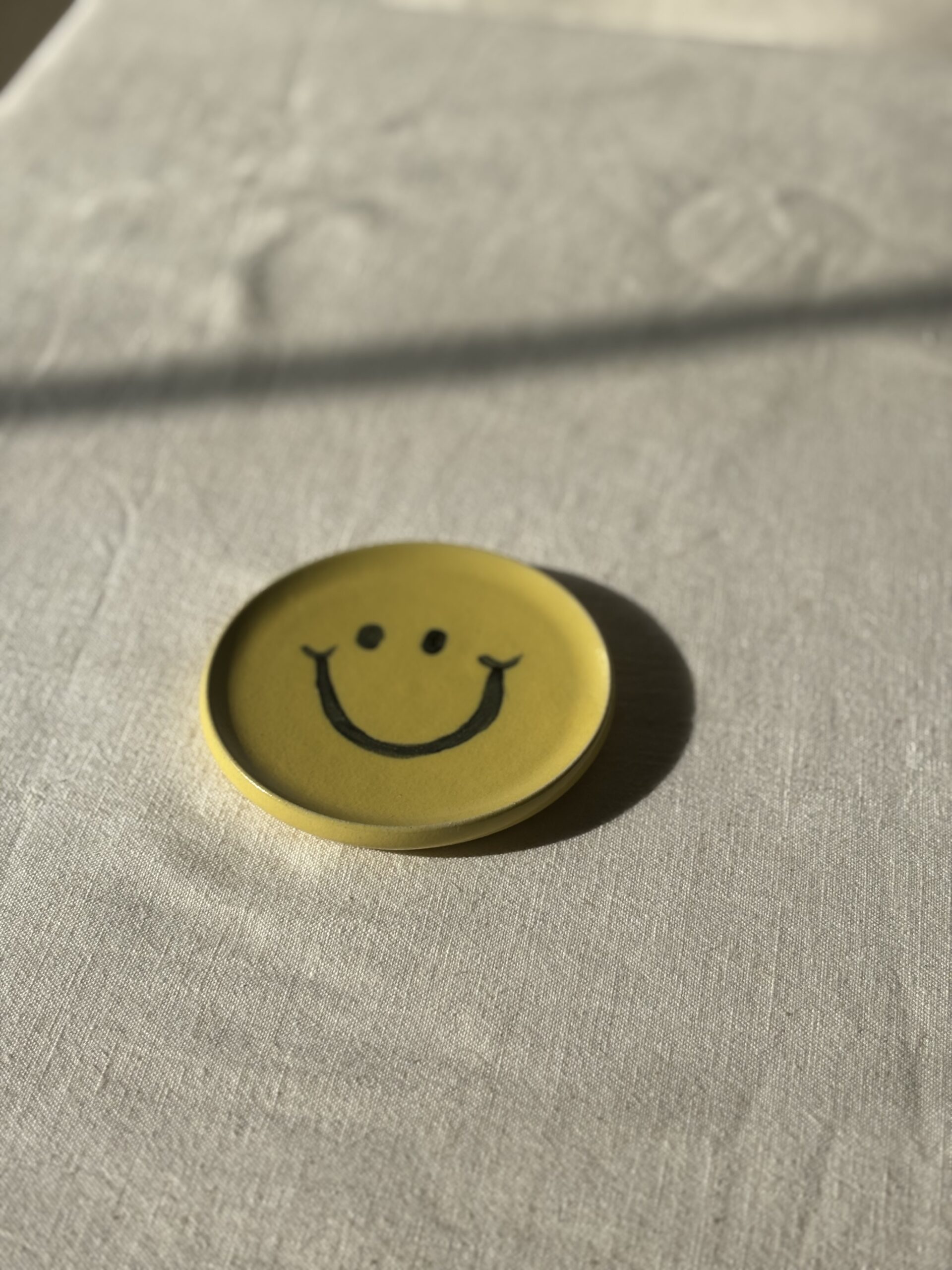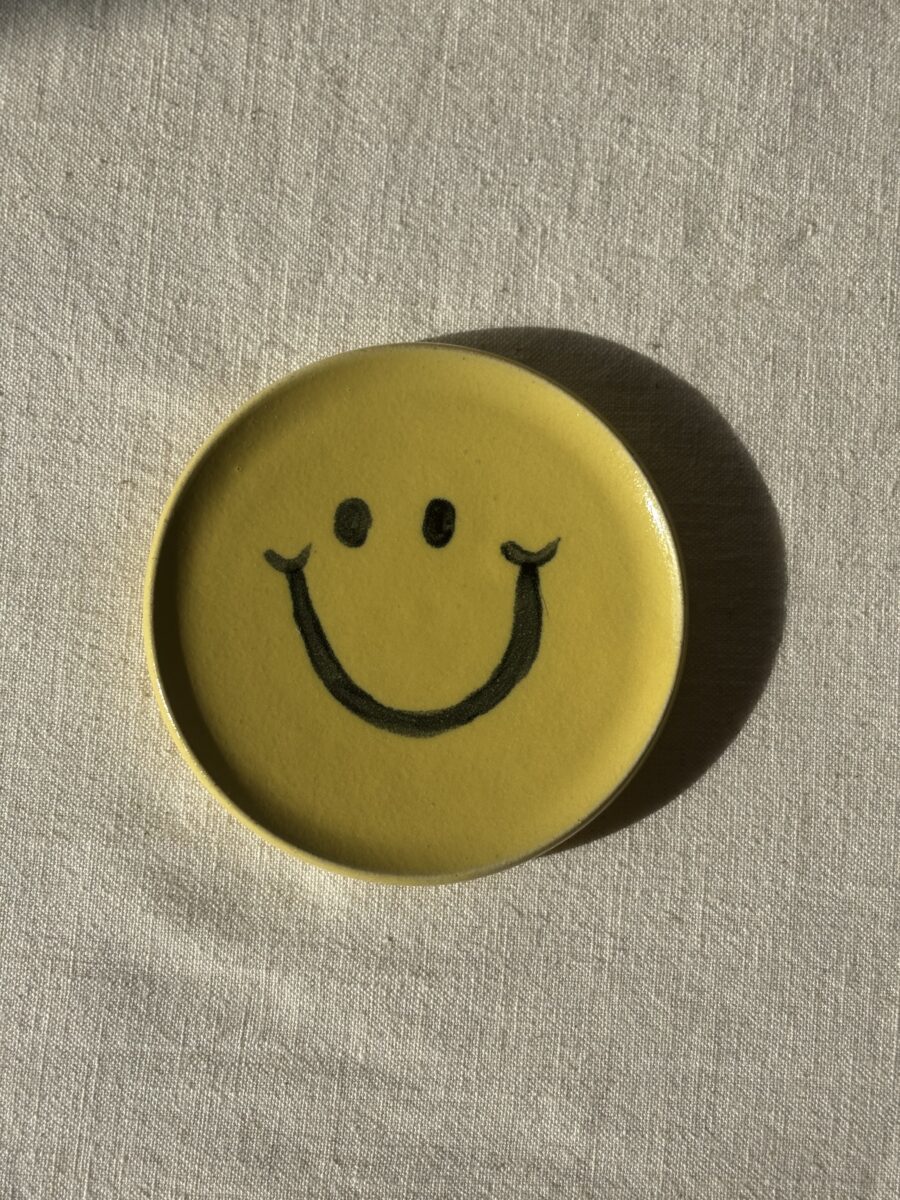 Color: Bright yellow glaze with a hand-painted smiley face.