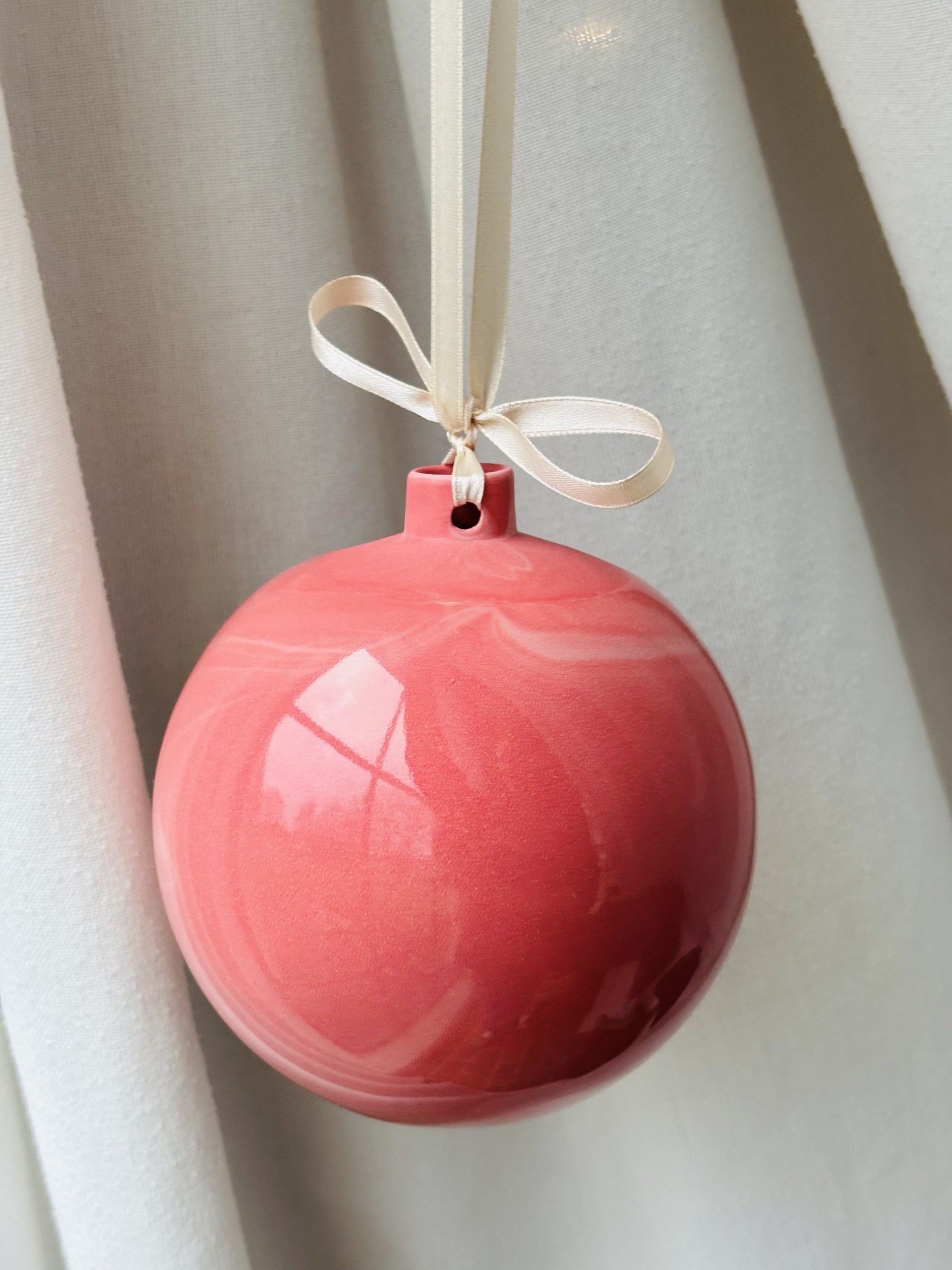 Hand-cast in porcelain, each X-mas Bauble is a one-of-a-kind piece. The vibrant swirls are created by mixing pigments directly into liquid porcelain, then pouring the colorful mix by hand into custom plaster mold. This process results in joyful, energetic patterns – no two baubles are ever the same!