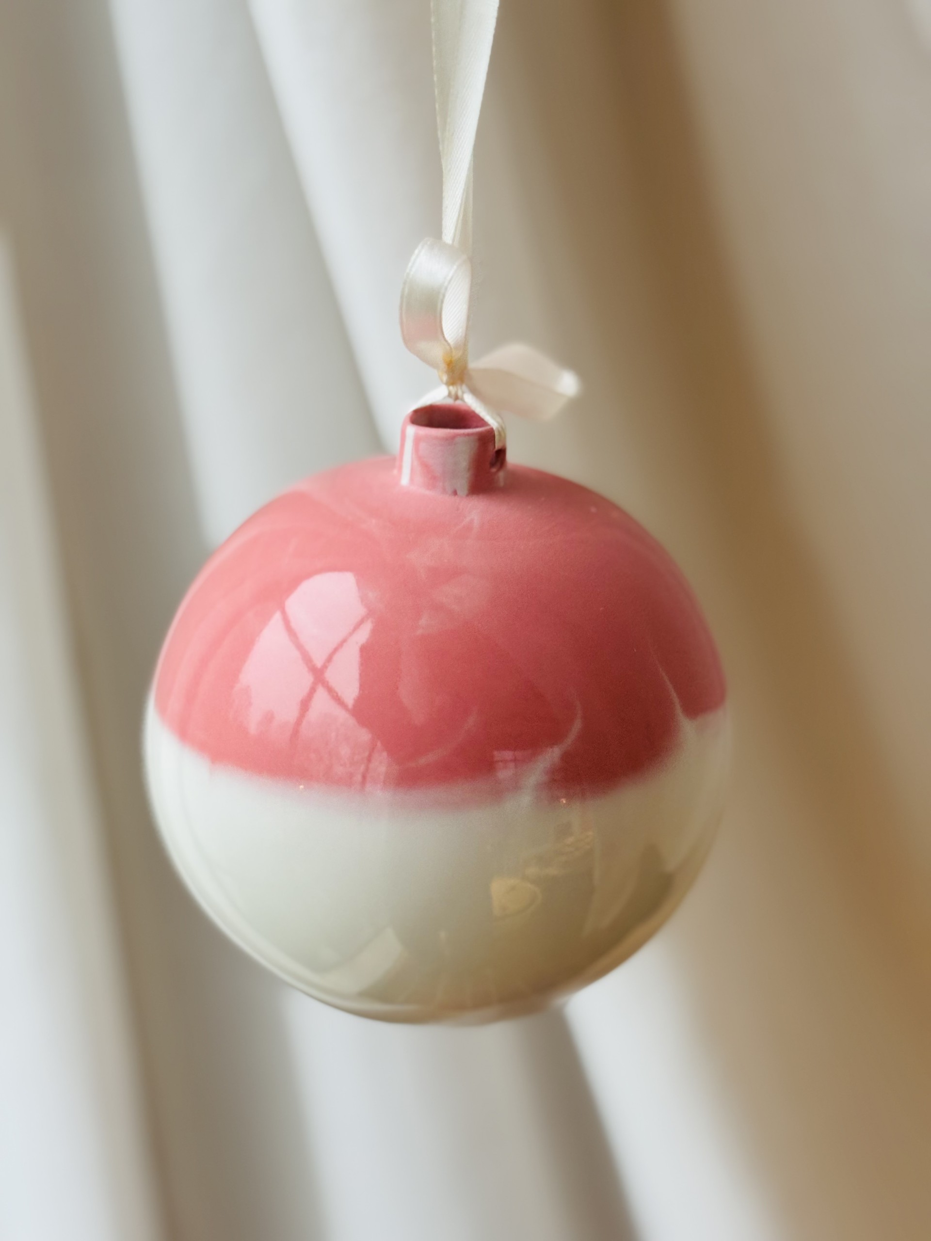 Hand-cast in porcelain, each X-mas Bauble is a one-of-a-kind piece. The vibrant swirls are created by mixing pigments directly into liquid porcelain, then pouring the colorful mix by hand into custom plaster mold. This process results in joyful, energetic patterns – no two baubles are ever the same!
