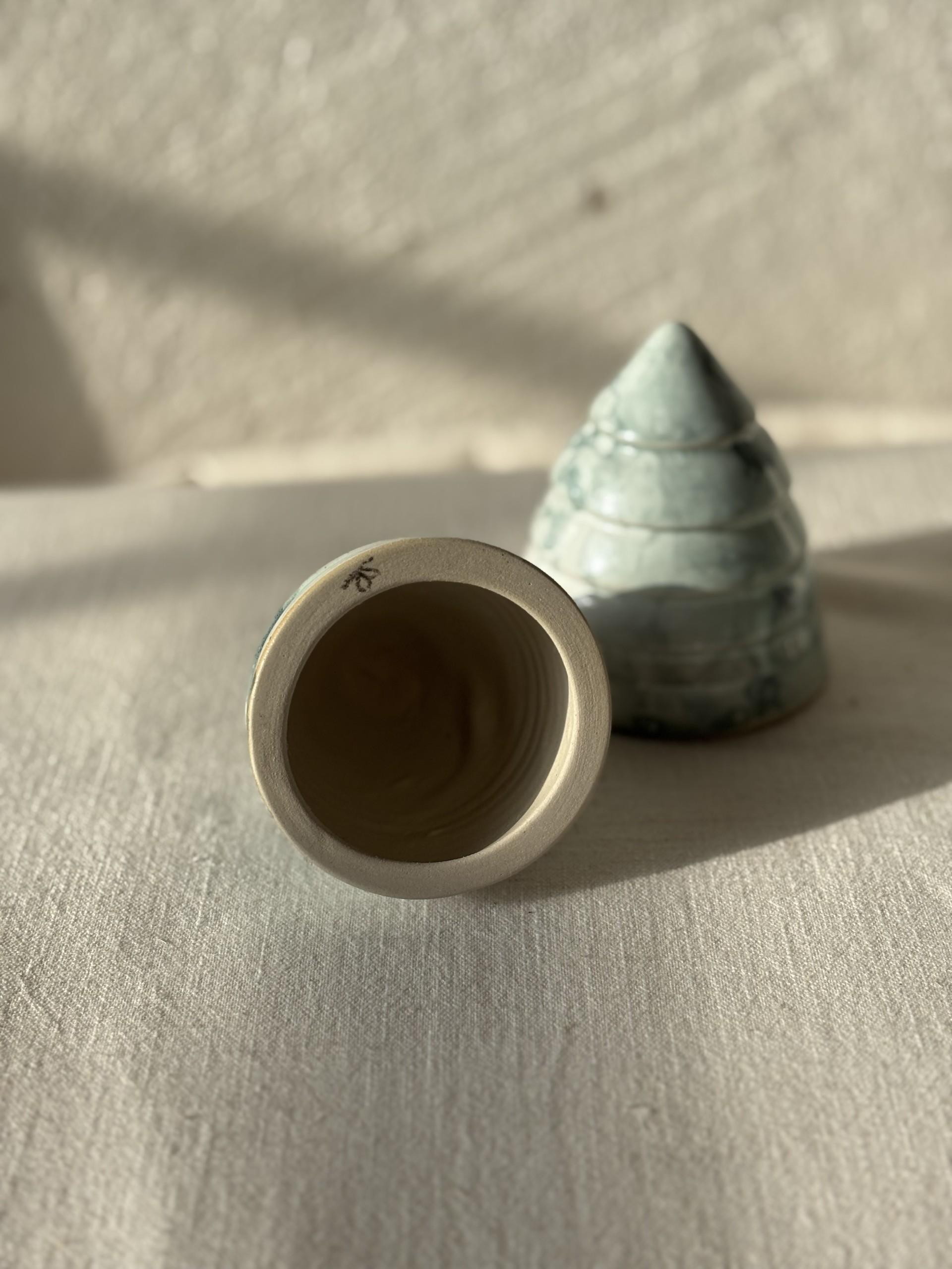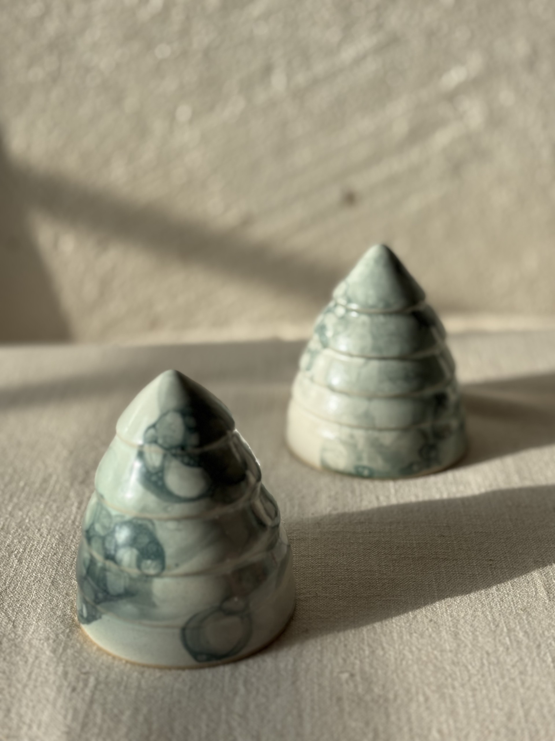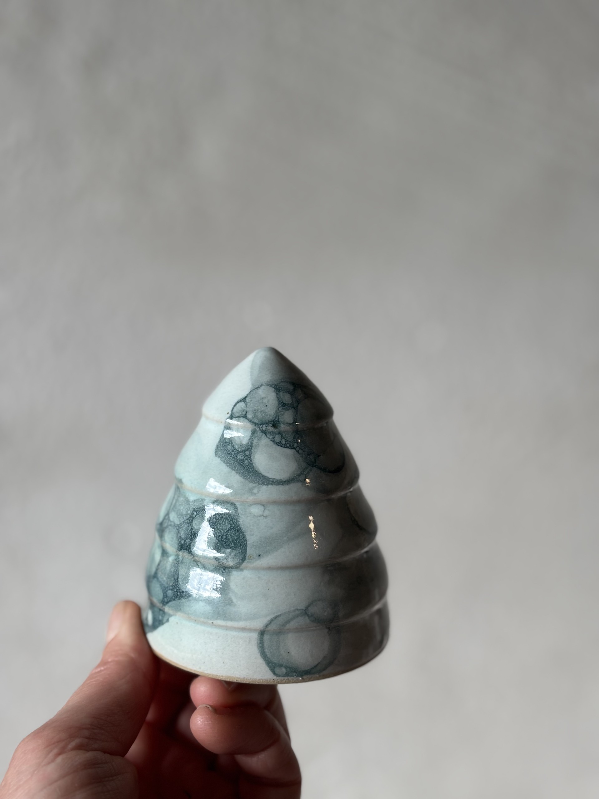 Each piece is wheel-thrown in stoneware and features a smooth, layered design reminiscent of a classic Christmas tree. Measuring approximately 5–7 cm wide and 8–10 cm tall, they make the perfect decoration for shelves, tables, or as part of a festive display.