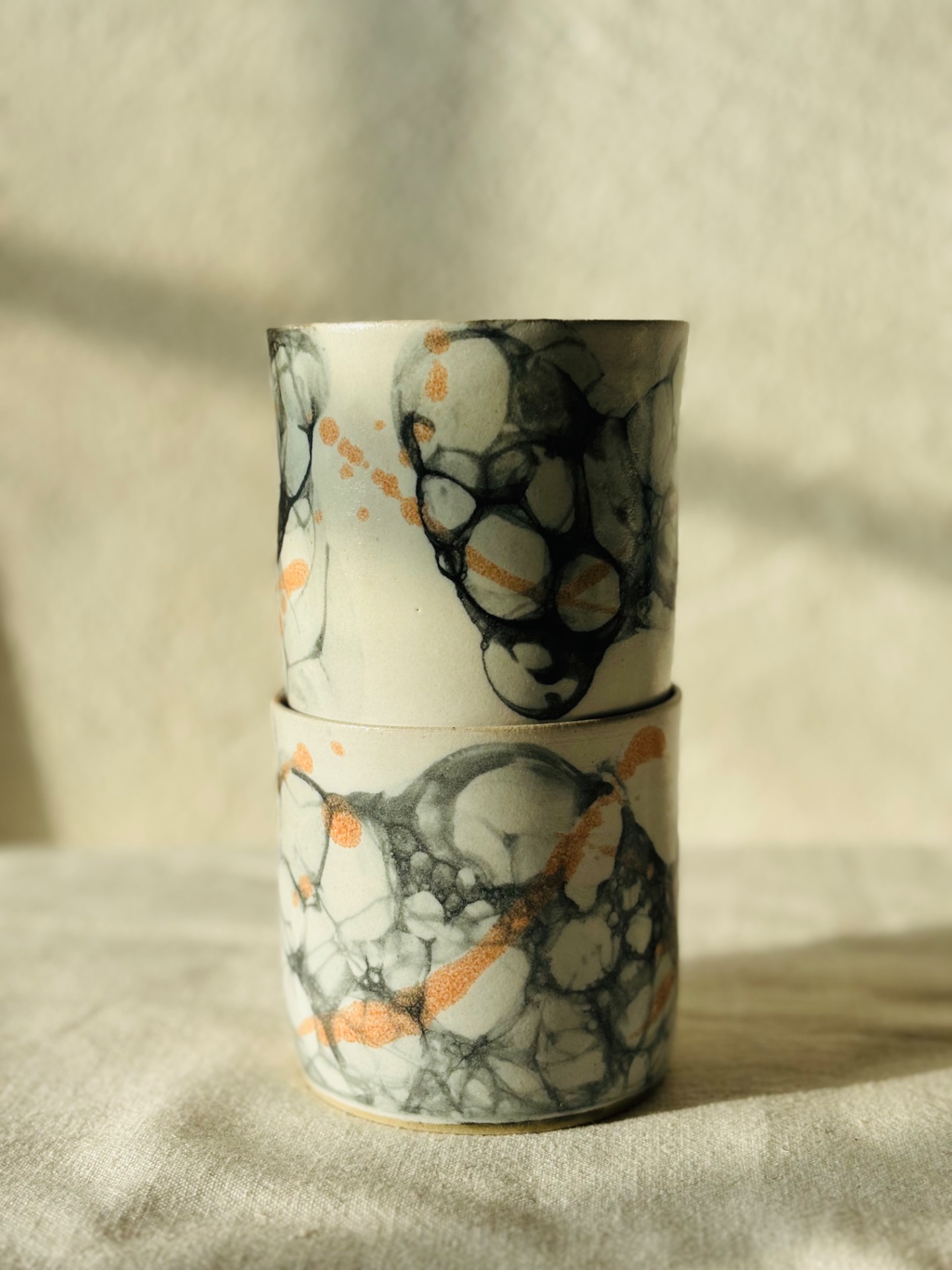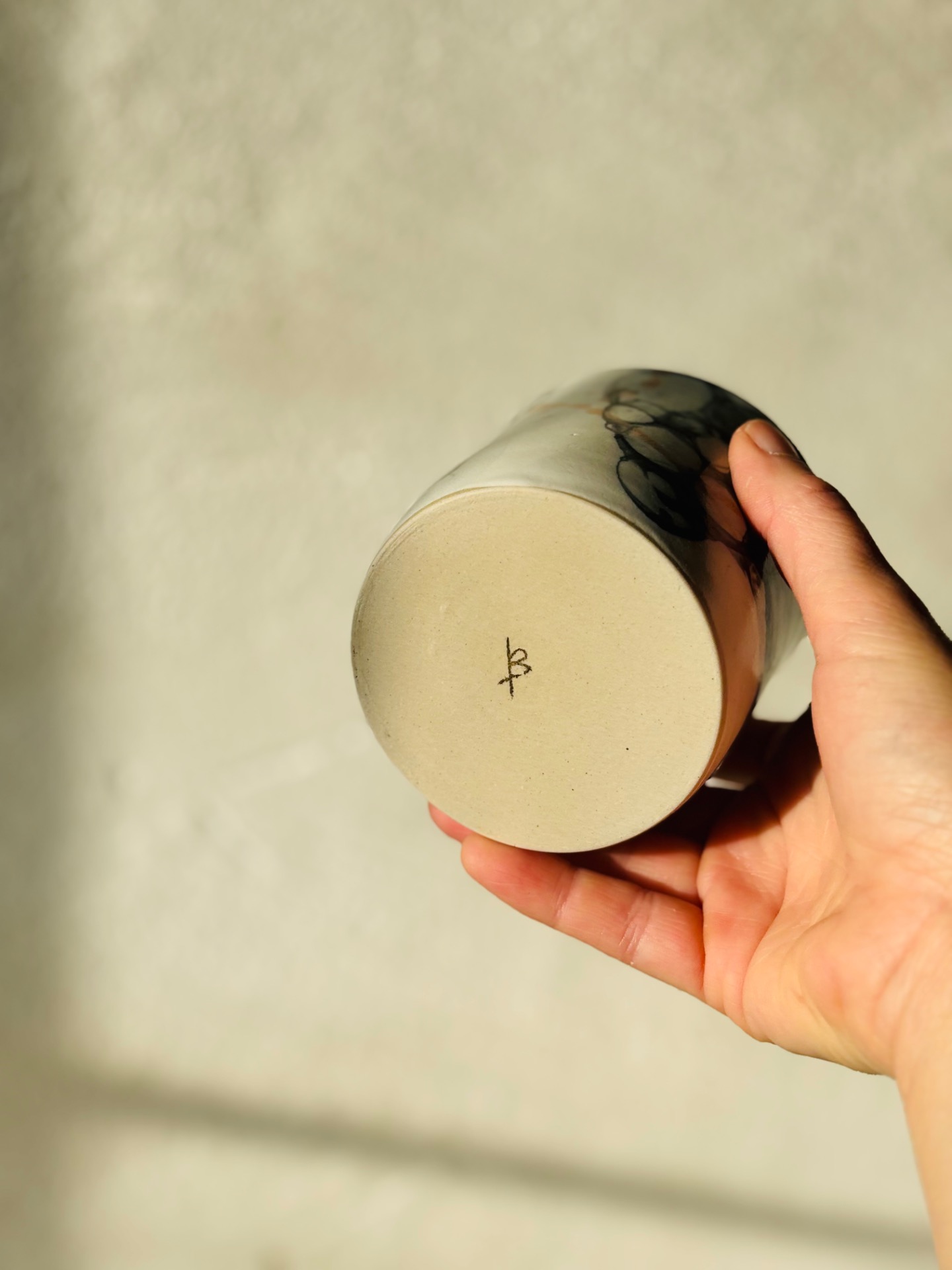Da hver kop er håndlavet med masser af kærlighed og omhyggelighed varierer de i både farve (og boblerne) og form fra dem på billederne. Hver kop er unik.