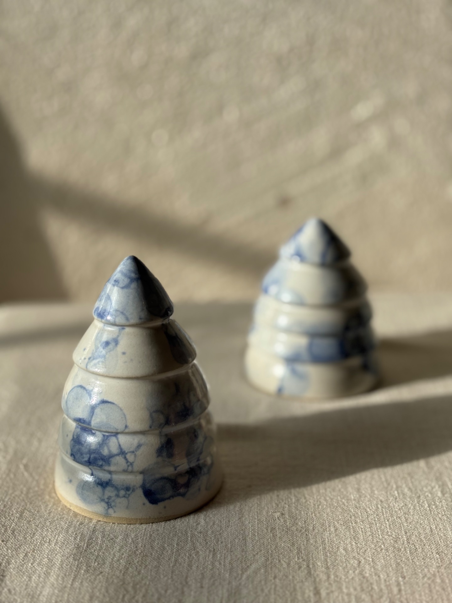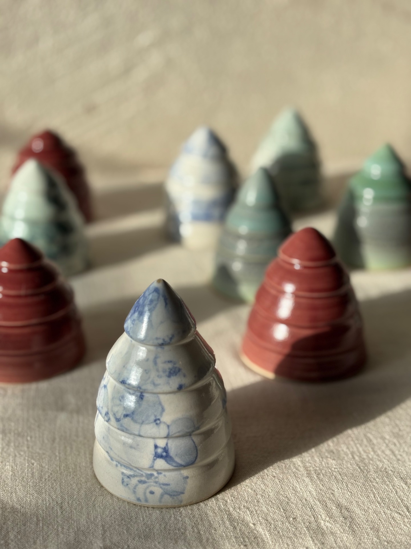 Each piece is handthrown in stoneware and features a smooth, layered design reminiscent of a classic Christmas tree. Measuring approximately 5–7 cm wide and 8–10 cm tall, these decorations are the perfect size to display on shelves, tables, or as part of a festive centerpiece.