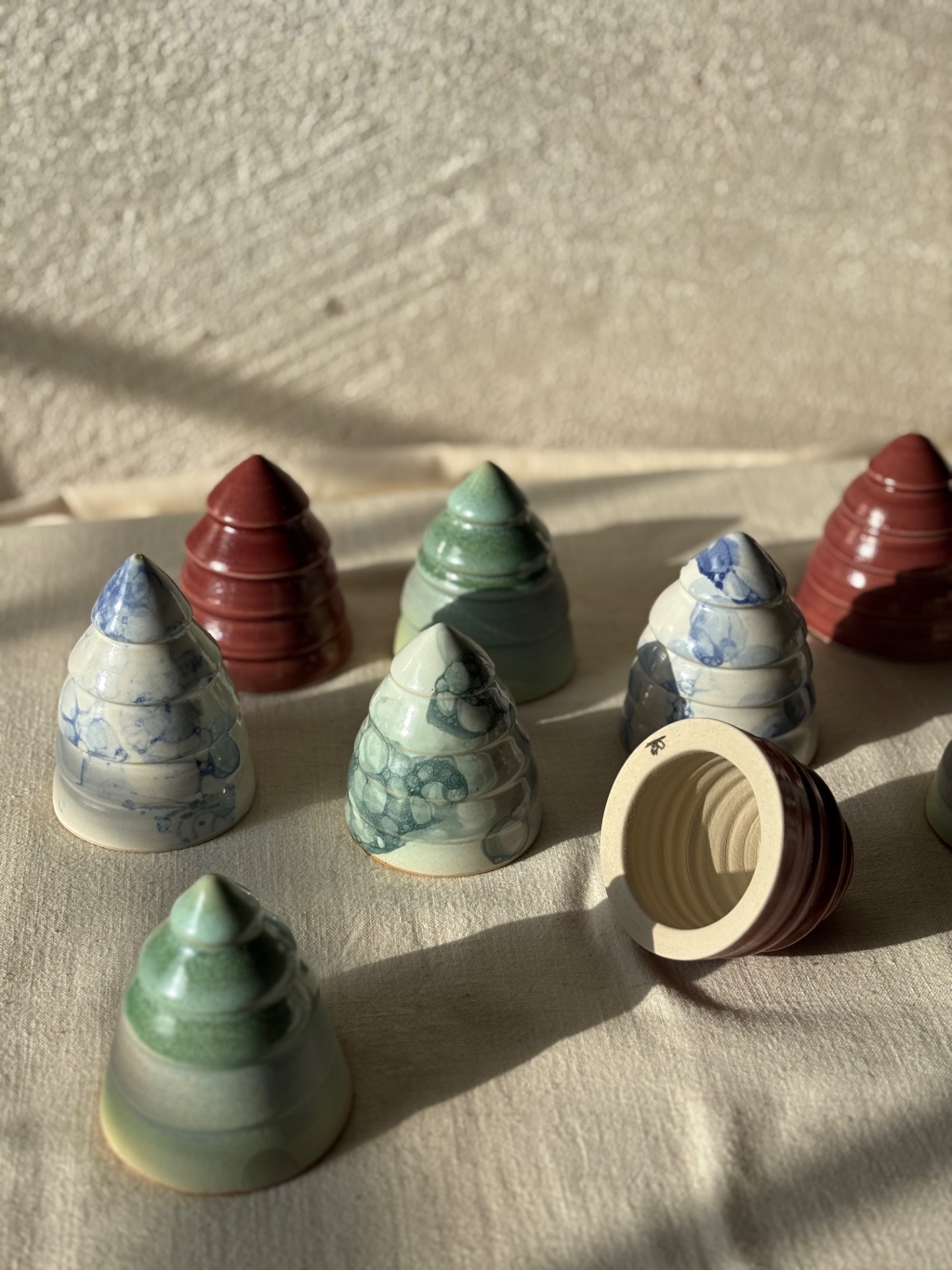 Hvert stykke er hånddrejet i stentøj og har et glat, lagdelt design, der minder om et klassisk juletræ. Med en størrelse på ca. 5–7 cm i bredden og 8–10 cm i højden er de den perfekte dekoration til hylder, borde eller som en del af en festlig dekoration.