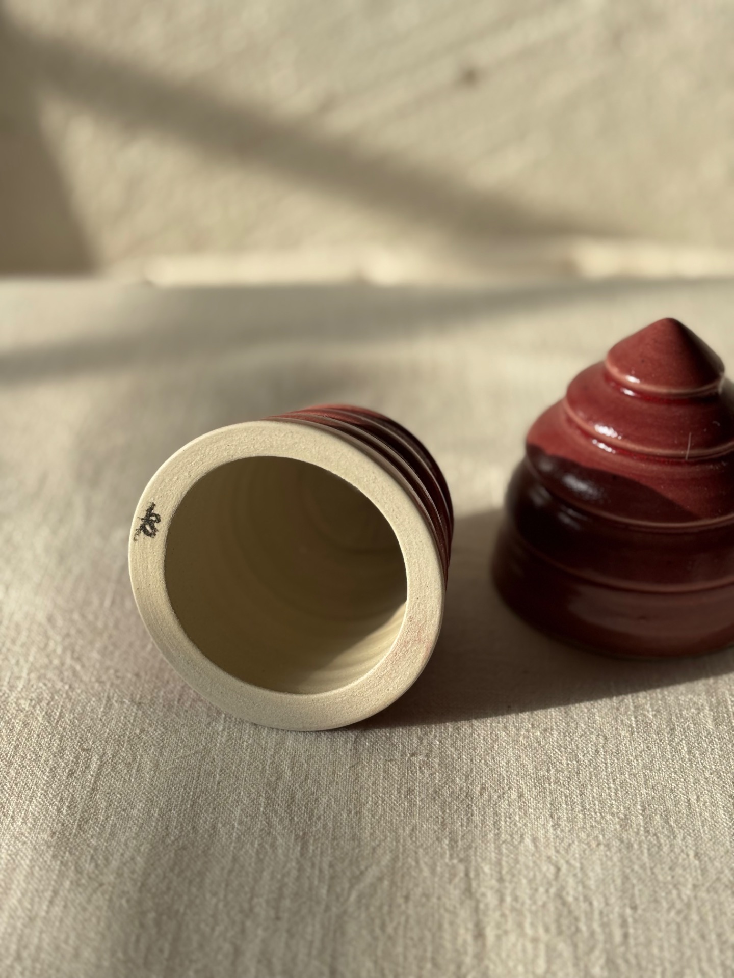 Each piece is handthrown in stoneware and features a smooth, layered design reminiscent of a classic Christmas tree. Measuring approximately 5–7 cm wide and 8–10 cm tall, these decorations are the perfect size to display on shelves, tables, or as part of a festive centerpiece.
